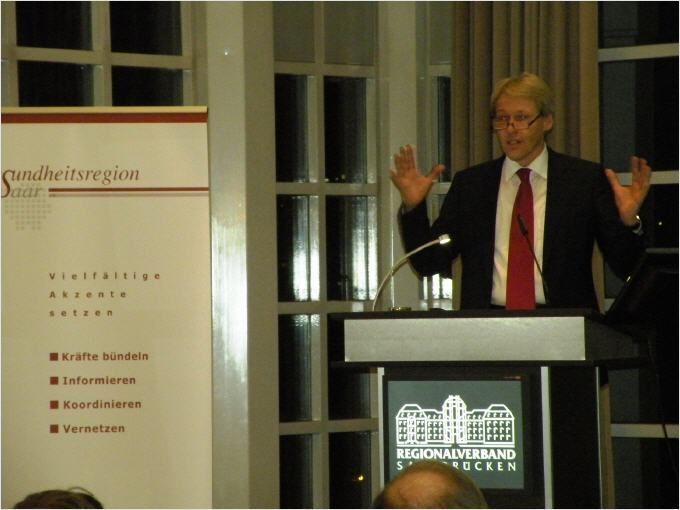 Arbeitnehmer, das sind rd. 60.000 Menschen, in der Gesundheitswirtschaft.Unter großem Beifall forderte der Vorsitzende der Gesundheitsregion Saar e.V. eine größere Nachhaltigkeit in der Gesundheitspolitik. Jede neue Legislaturperiode mit Paradigmenwechsel verunsichere sowohl Arbeitgeber als auch Arbeitnehmer.