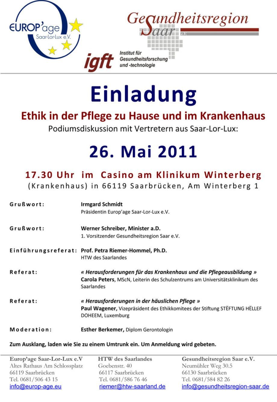 In Zusammenarbeit mit Europ’age Saar-Lor-Lux e.V. und dem Institut für Gesundheitsforschung und – technologie (igft) befasste sich am 26. Mai 2011 im Casino des Klinikums Saarbrücken Winterberg die Gesundheitsregion Saar e.V. mit dem Thema Ethik in der Pflege.