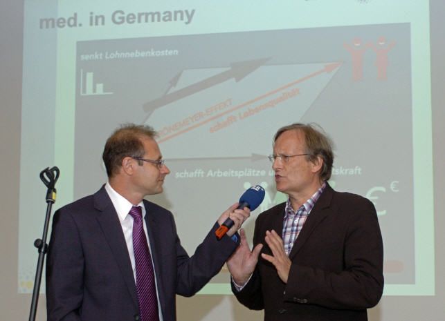 Als Beispiel nannte er die Aktivitäten der TK, die sich für die Akupunktur stark gemacht habe und jetzt auch Osteopathie-Anwendungen übernimmt. Dem medizinischen Wirtschaftszweig gibt Grönemeyer die Bezeichnung "med. in Germany". "Gesundheit ist nur durch Investitionen möglich, sowohl in unsere Kinder als auch in medizinische Einrichtungen. 'Med. in Germany' schafft so Lebensqualität, Arbeitsplätze und Wirtschaftskraft".