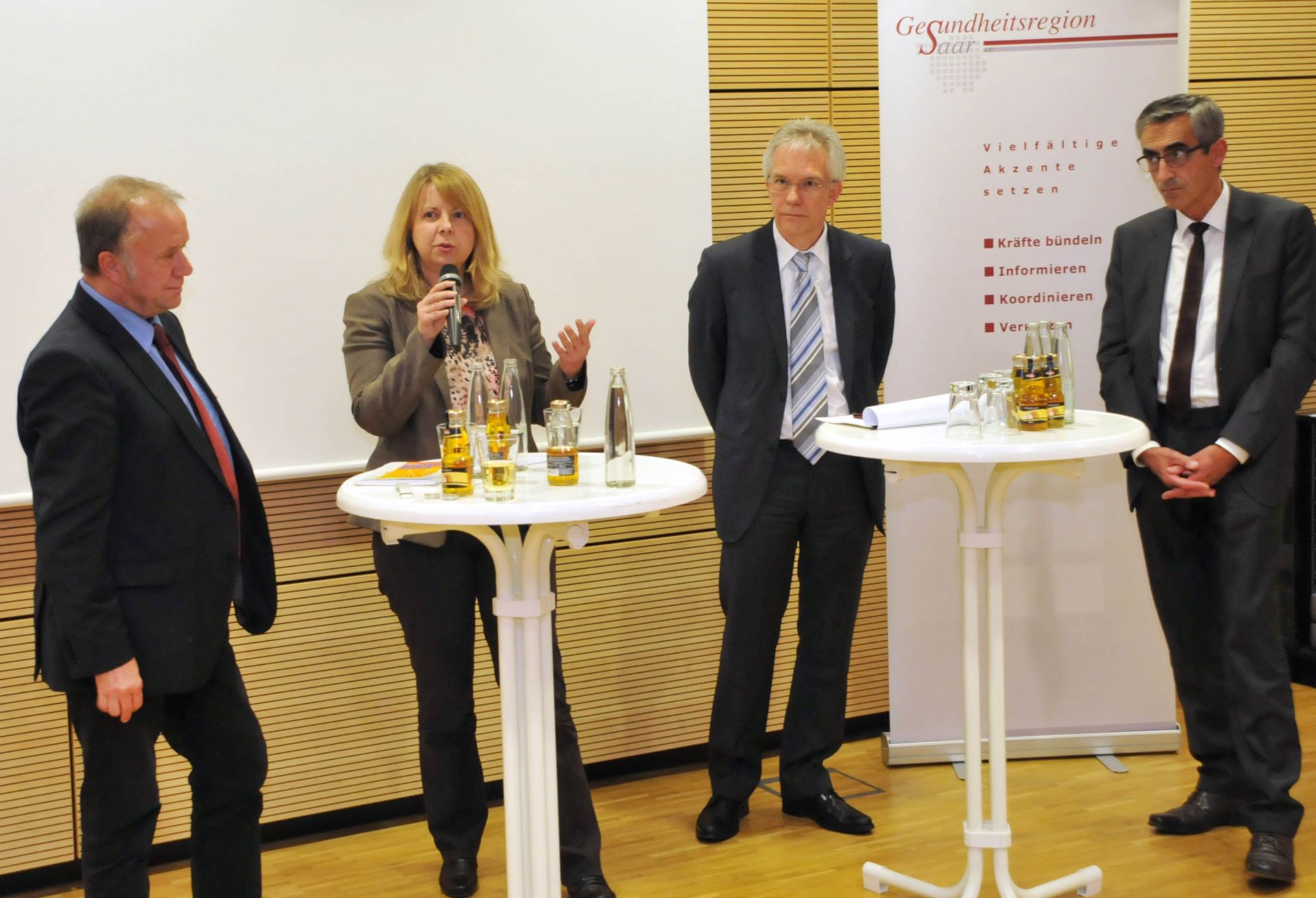Die sich anschließende Diskussionsrunde wurde von Dr. med. Thomas Vaterrodt, dem stellvertretenden Vorsitzenden der Gesundheitsregion Saar, moderiert. Neben dem Referenten Prof. Beivers und Herrn Minister Storm nahmen daran Christiane Firk, Vertreterin der AOK Rheinland-Pfalz-Saarland, Alfons Vogtel, Vorsitzender der Saarländischen Krankenhausgesellschaft sowie Dr. med. Josef Mischo, Präsident der Saarländischen Ärztekammer, teil.