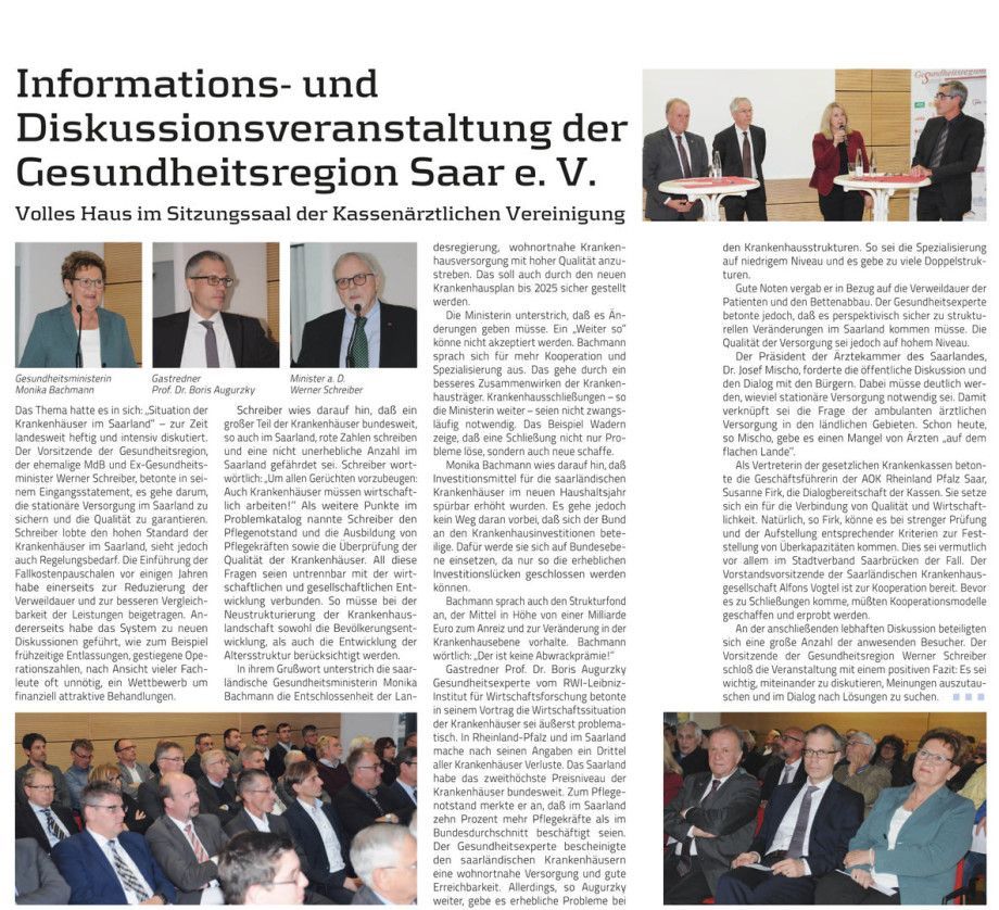Unter Leitung des stellvertretenden Vorsitzenden der Gesundheitsregion Saar e.V., Axel Mittelbach, befassten sich die Landtagsabgeordneten Hermann Scharf (CDU), Dr. Magnus Jung (SPD), für die Krankenkassen der Vorstand der IKK Südwest Prof. Jörg Loth, mit der Saarländischen Situation. Dabei wurde deutlich, dass in den vergangenen Jahren große Anstrengungen zur Verbesserung der Pflegesituation unternommen wurden.