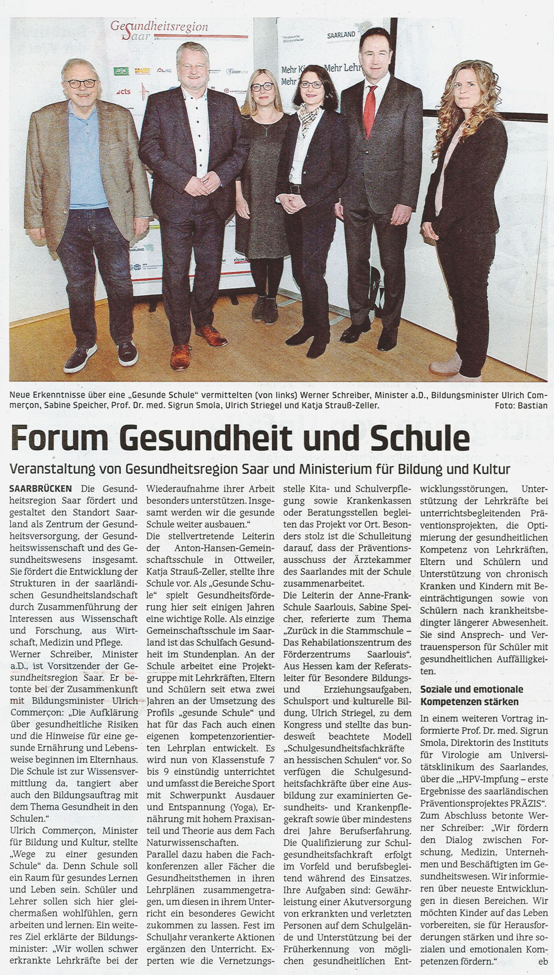 Die Aufklärung über gesundheitliche Risiken und die Hinweise für eine gesunde Ernährung und Lebensweise beginnt im Elternhaus, tangiert aber auch den Bildungsauftrag der Schulen. Die Gesundheitsregion Saar e.V. befasst sich in einer Kooperationsveranstaltung mit dem Ministerium für Bildung und Kultur des Saarlandes mit diesem für unsere Gesellschaft wichtigen Thema. Es werden Projekte vorgestellt, die auf unterschiedliche Weise Zusammenhänge von Schule und Gesundheit aufzeigen.