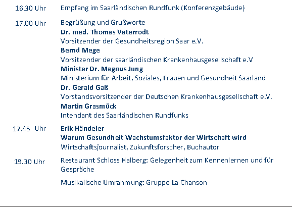Als Teil der Gesundheitsregion Saar e.V. nehmen die Krankenhäuser am Diskurs aller in der saarländischen Gesundheitswirtschaft Tätigen aktiv teil.